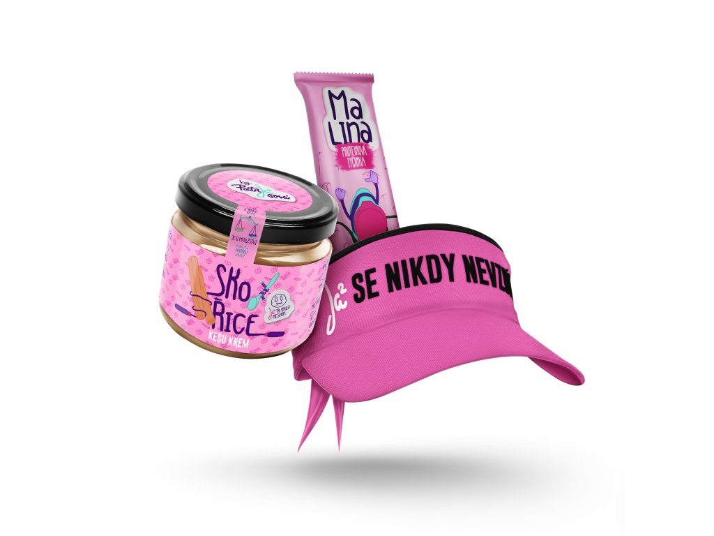 Ořechový krém SKOŘICE, malinová tyčinka, kšilt proti slunci
